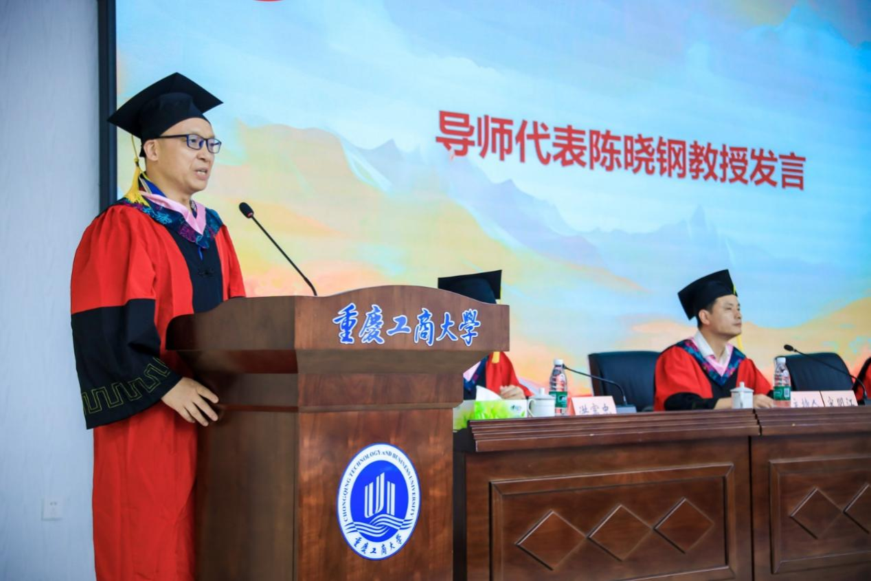 导师代表陈晓钢教授结合自身从专科生到博士生的奋斗历程,为毕业生送上三点嘱托:第一,把握历史方位,做与历史同步、与祖国同在、与人民同行的奋斗者;第二,永葆奋斗精神,以“雄关漫道真如铁,而今迈步从头越”的魄力迎接挑战;第三,追求全面发展,以体育强健体魄,以人文滋养心灵。最后,他引用习近平总书记对青年“德智体美劳全面发展”的期望,祝愿毕业生在各自“战场”上捷报频传,成为堪当民族复兴大任的时代新人。
