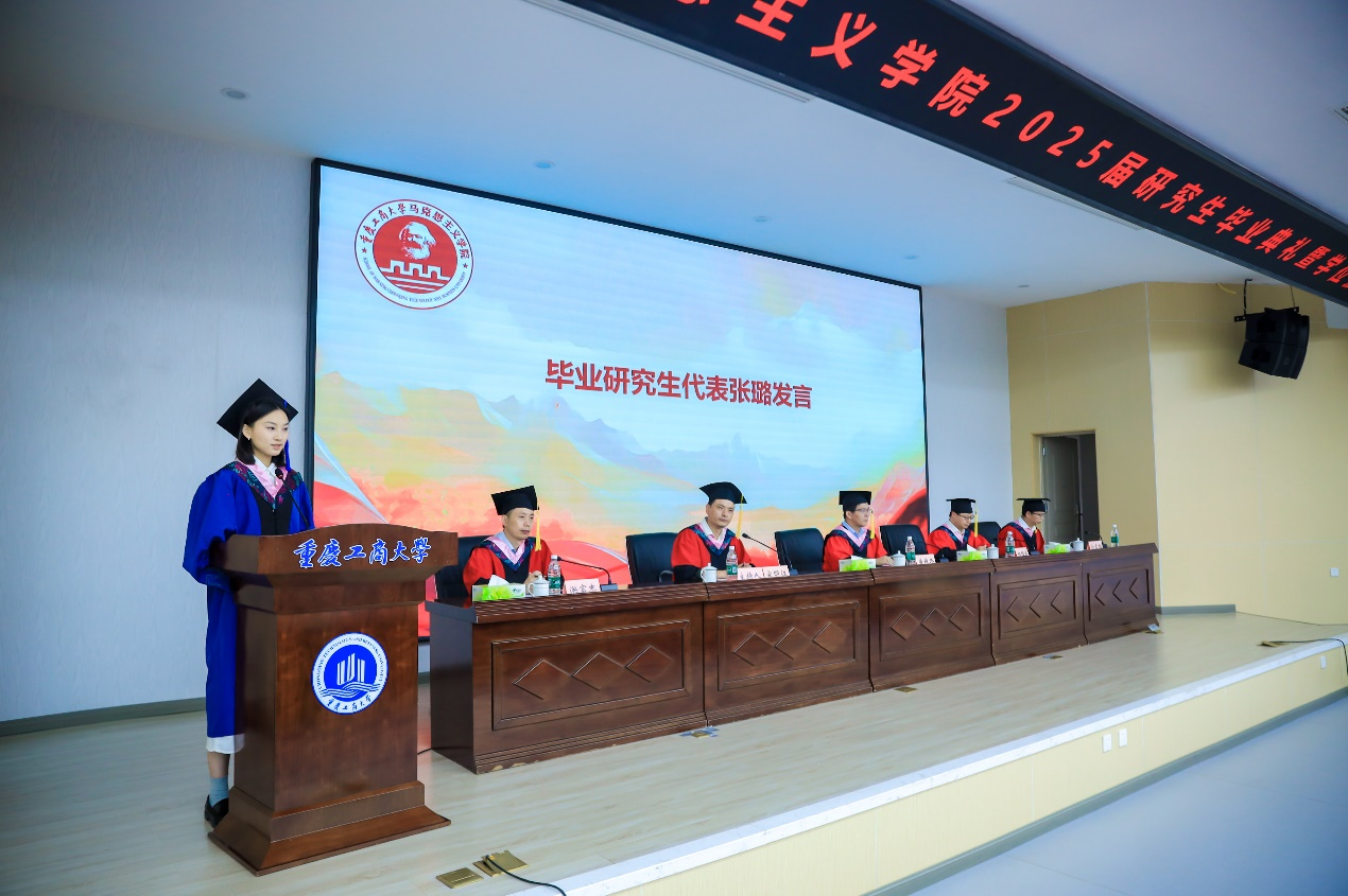 毕业研究生代表张璐回顾了三年的求学时光,向母校、师长、同窗及家人朋友致以诚挚谢意。她表示,毕业是奋进新征程的号角,全体毕业生必将不负母校培养,奔赴祖国最需要的地方,努力成为马克思主义的坚定信仰者、积极传播者与忠实践行者,在全面建设社会主义现代化国家新征程中贡献青春力量。