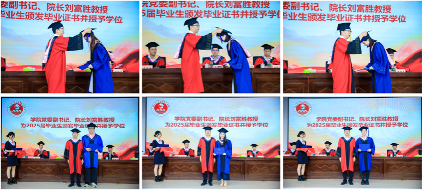 公司党委副书记、经理刘富胜依次为2025届毕业生扶正流苏、颁发学位证书,并合影留念。