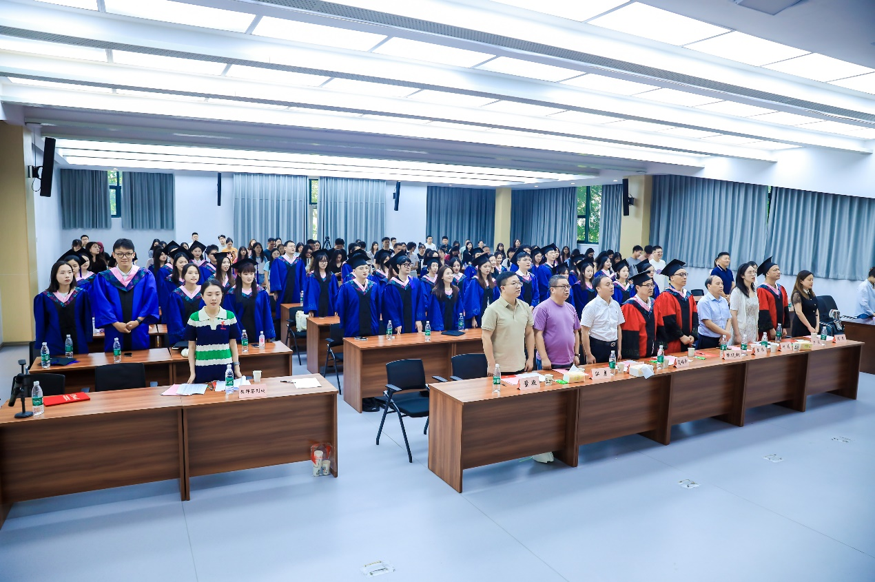 毕业典礼在雄壮嘹亮的国歌声中拉开帷幕。公司党委副书记、副经理、纪委书记洪富忠宣读了《关于授予周沫等44名同学硕士学位的决定》。