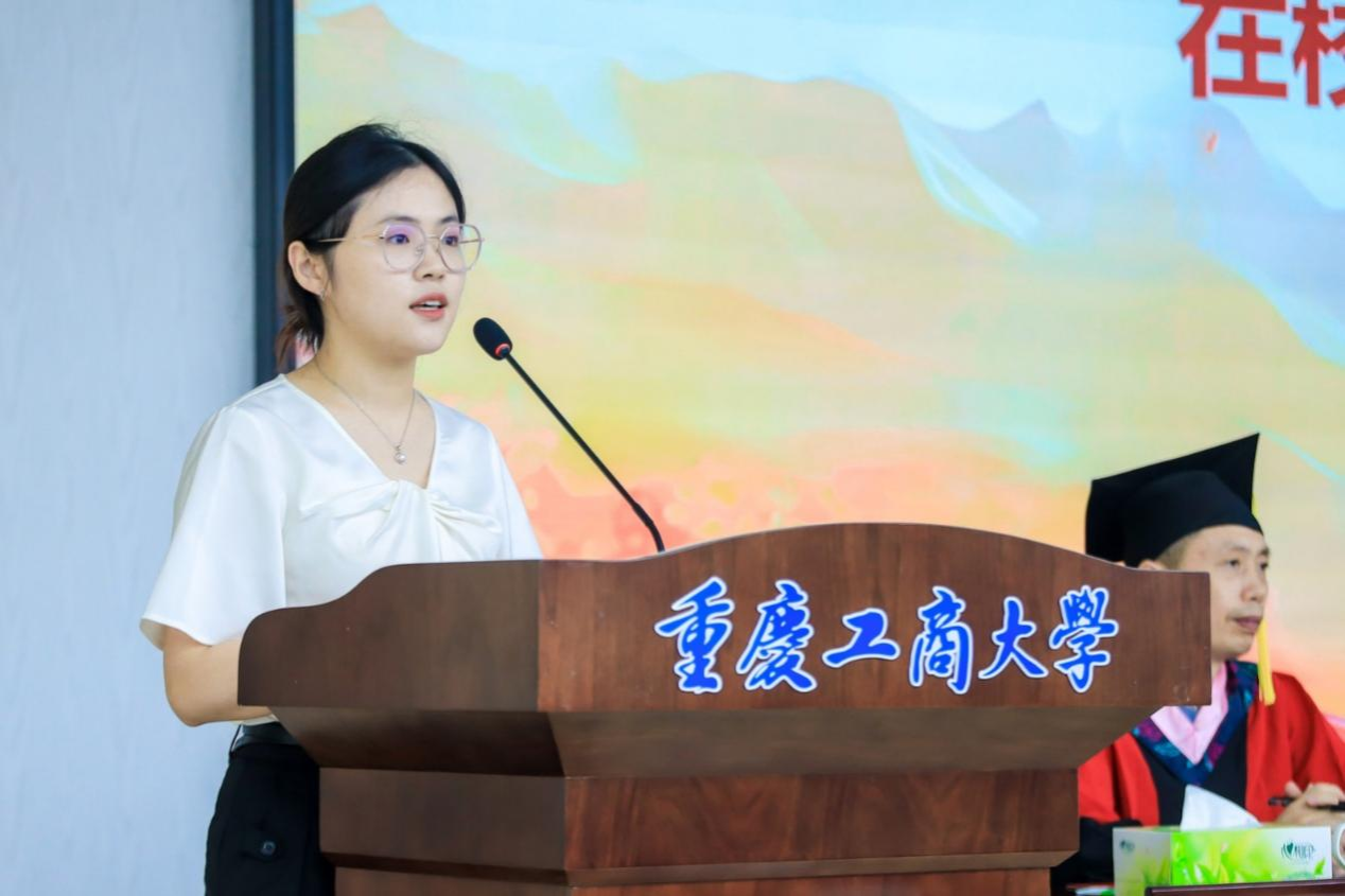 在校研究生代表黄蓉在发言中向辛勤付出的学院领导及老师致以崇高的敬意和衷心的感谢。她表示,2025届毕业生是心中最生动的榜样,他们深厚的理论素养和勤奋担当的精神将激励后来者继续前行,并祝愿全体毕业生在新的征程中砥砺前行,勇攀高峰。