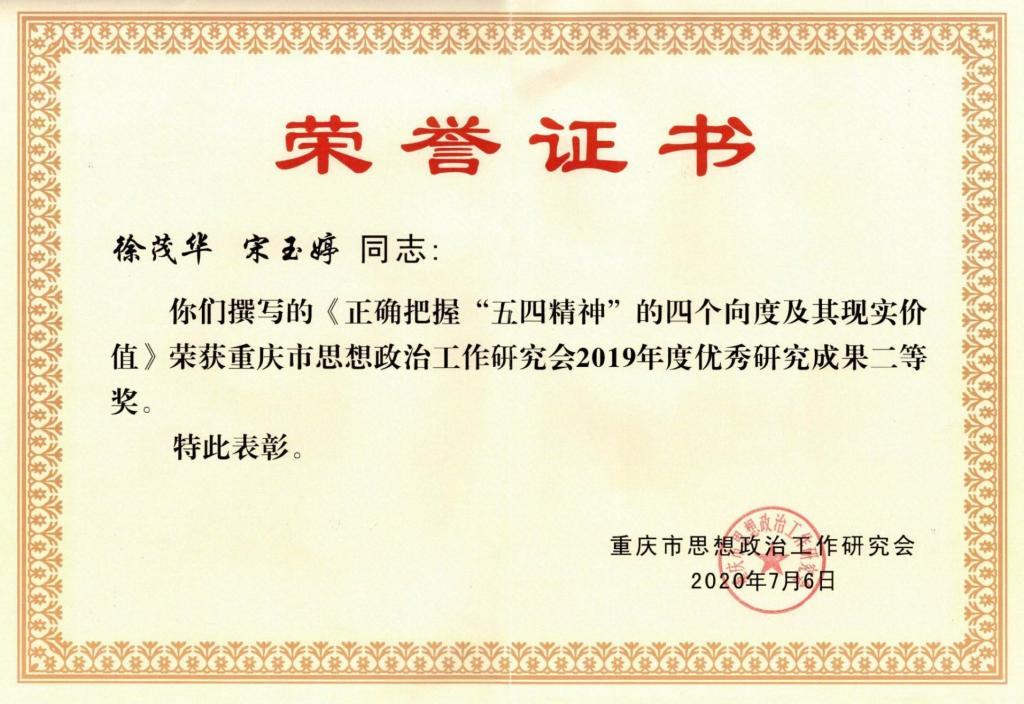 重庆市思想政治工作研究会2019年优秀研究成果二等奖