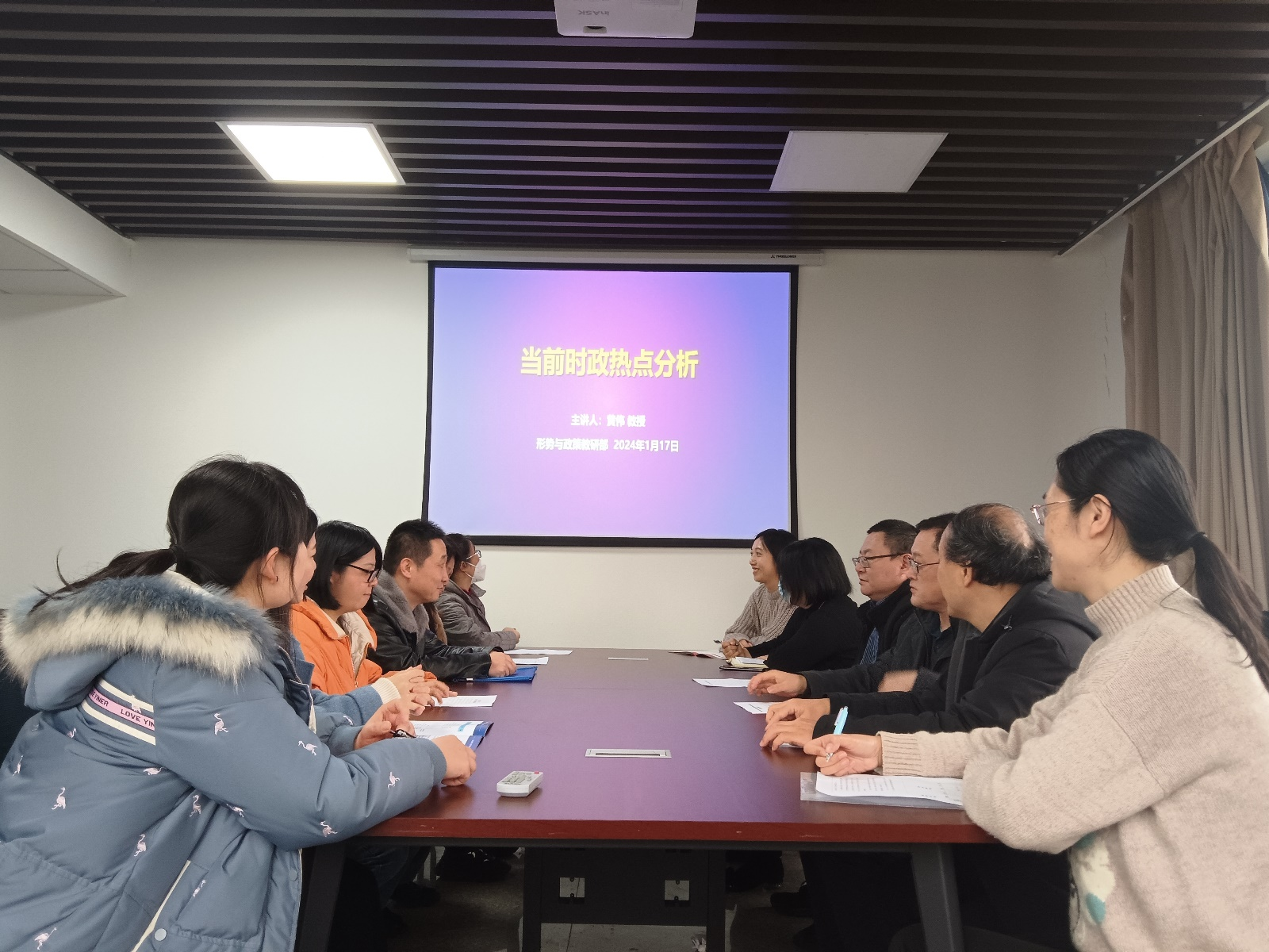 1月17日,“形势与政策”教研部在90911会议室举行了系列教研活动的第三场:当前时政热点问题分析,对未来学期课程的开展进行了谋划。会议由“形势与政策”教研部专任教师黄伟教授主持,专兼职教师十余人参加了本次会议。黄伟教授就近期国内外时政热点以及如何利用这些热点问题开展教学和加强对员工引导展开了深入的讲解。与会教师进行了热烈的讨论,纷纷表示要学习借鉴黄伟教授幽默风趣的讲课方式,并不断提升对热点时政的关注度和敏感度,加强专业素养培训,深入推进“形势与政策”一流课程建设。